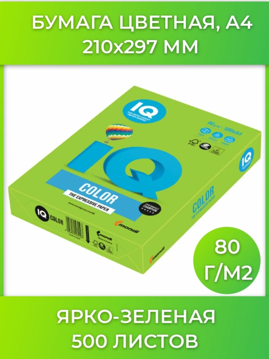 Бумага IQ "Color intensive" А4, 80г/м2, 500л. (ярко-зелёный), 1 шт