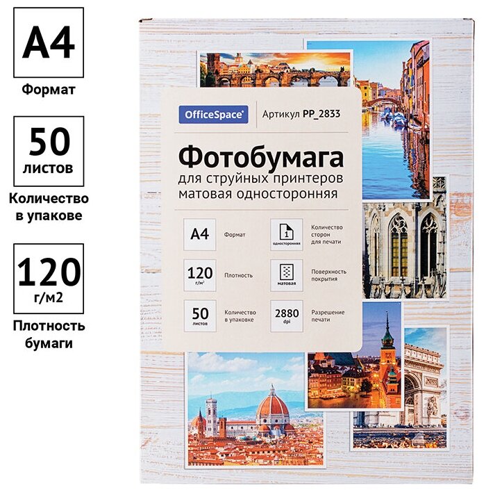 Купить Фотобумага А4 для струйных принтеров OfficeSpace, блок 120 г/м?, 50 листов, матовая, односторонняя O .