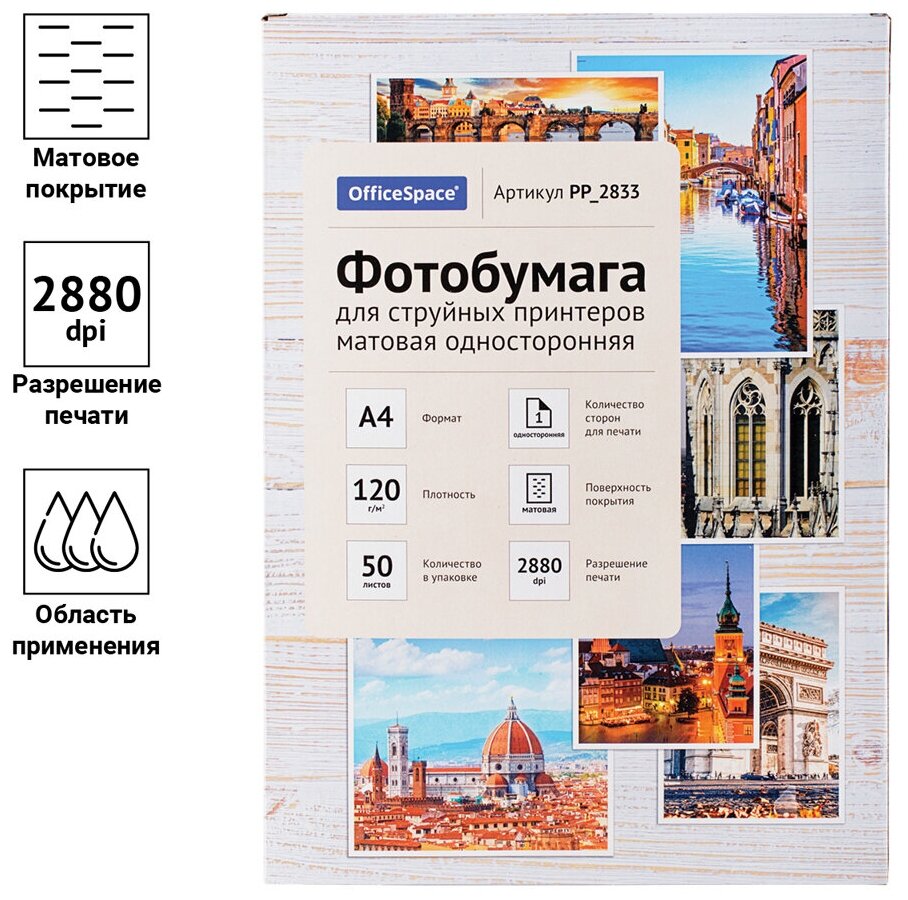 Фотобумага для струйной печати А4, 50 листов OfficeSpace, 120 г/м2, односторонняя, матовая