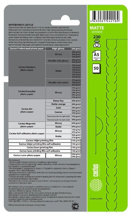 Фотобумага Cactus A5/230г/м2/50л./белый матовое для струйной печати