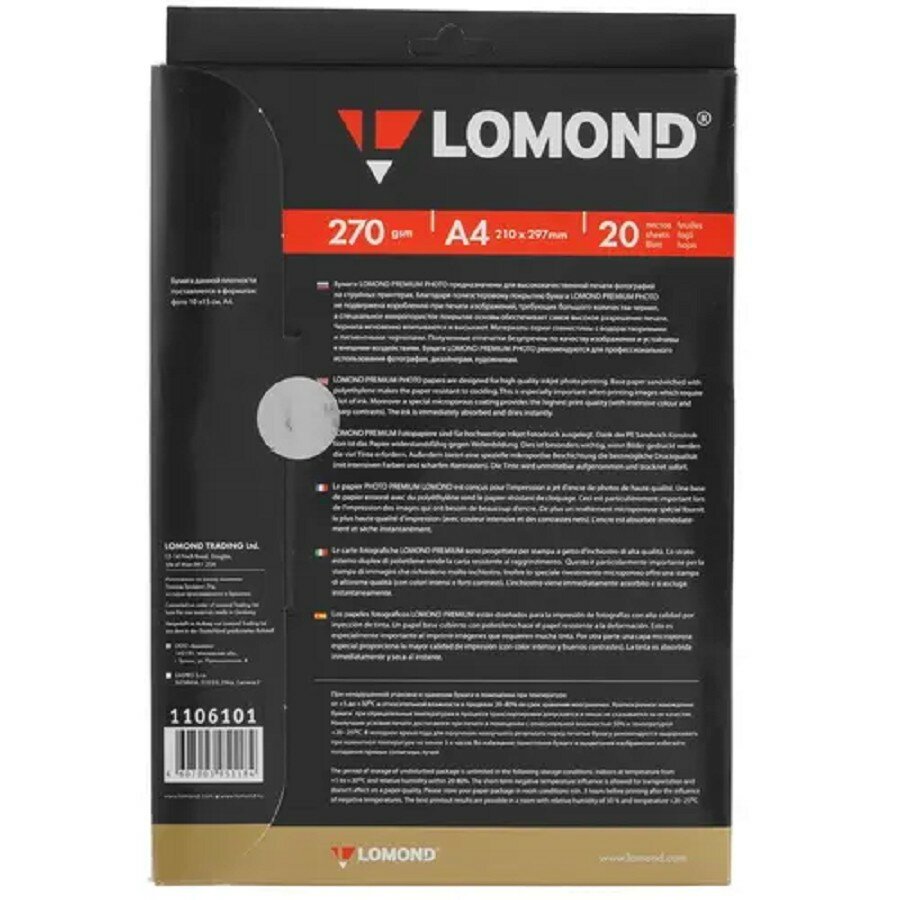 Бумага A4 Lomond суперглянцевая тепло-белая 270г/м2 20л (1106101) .