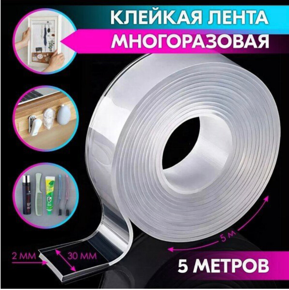 Многоразовая двухсторонняя прозрачная крепежная лента "Скотч NANO tape" 3 м х 30 мм, 2 мм, DASWERK, 607928, 607928