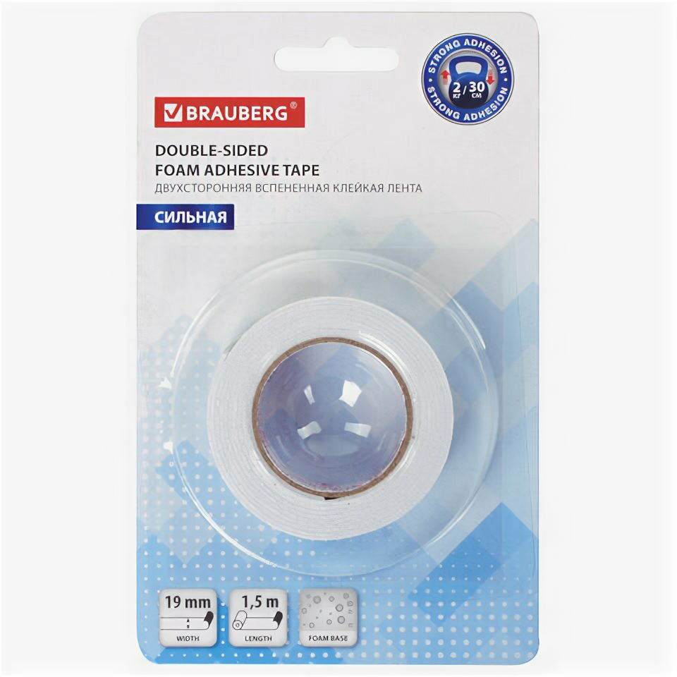 Купить Клейкая лента BRAUBERG двухсторонняя BRAUBERG 606419,19 мм х 1,5 м, на вспененной основе 1 мм, прочная, блистер