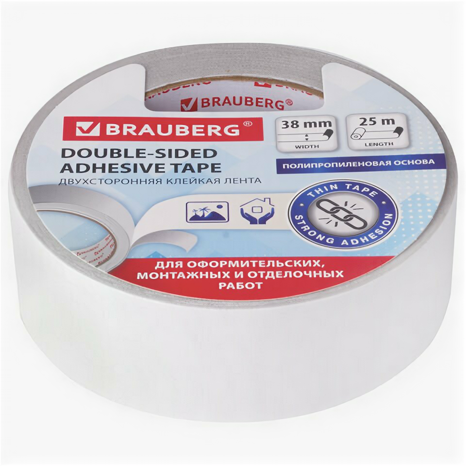 Клейкая двусторонняя лента 38 мм х 25 м тонкая основа полипропилен 90 микрон BRAUBERG 606426 1 шт
