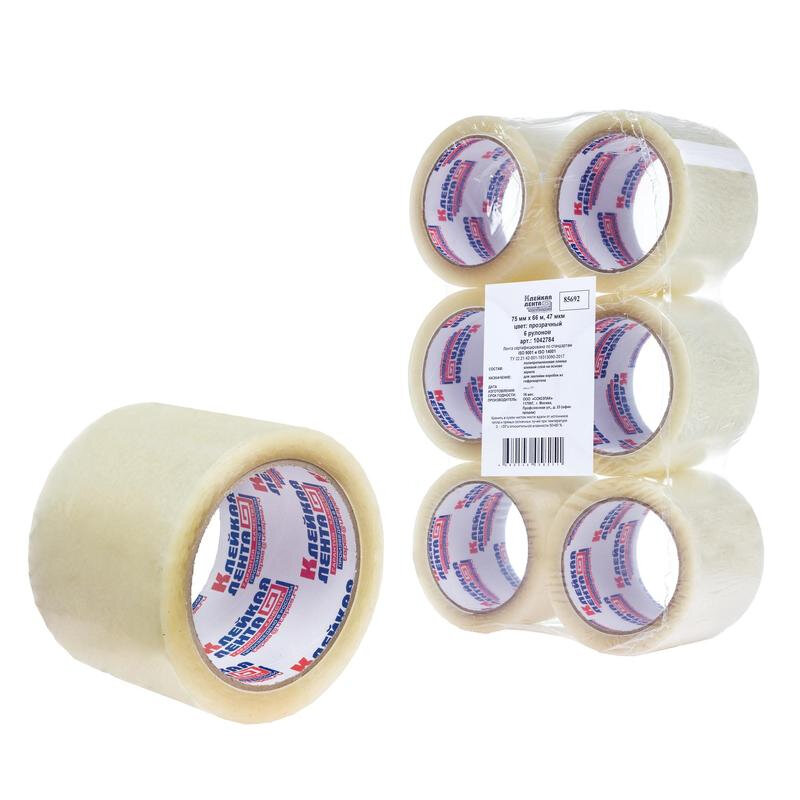 Клейкая лента упаковочная 75мм х 66м 47мкм прозрачная Россия 6 шт/уп 1042784
