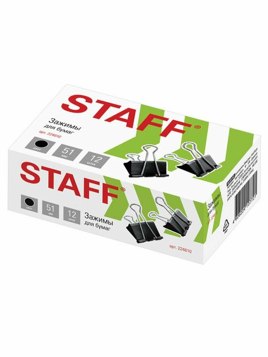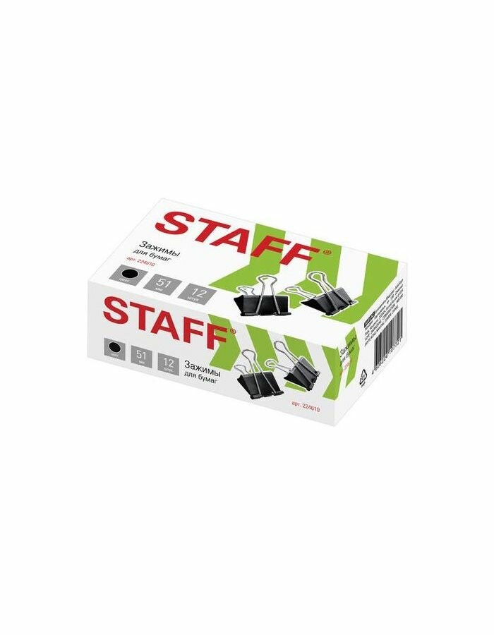 Зажимы для бумаг STAFF, комплект 12 шт., 51 мм, на 230 листов, черные, картонная коробка, 224610