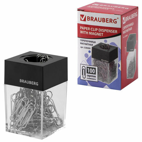 Скрепочница магнитная BRAUBERG со 100 никелированными скрепками 28 мм, прозрачный корпус, 228400 (цена за 1 ед.товара)