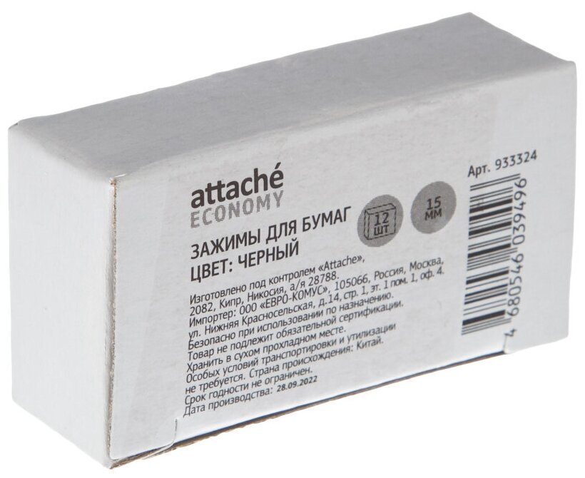 Зажимы для бумаг 15мм 12шт в упаковке, Attache Economy, в картонной коробке, цвет черный
