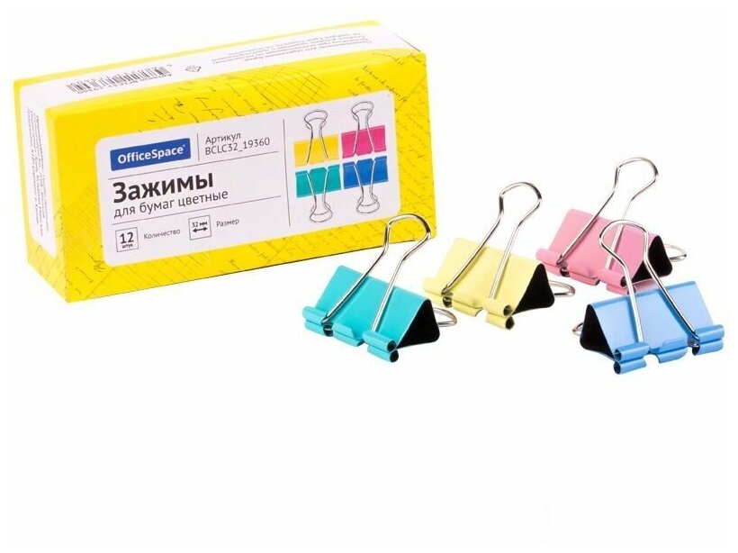 Купить Зажимы для бумаг OfficeSpace 32 мм, 12 штук, цветные, картонная коробка (BCLC32_19360)