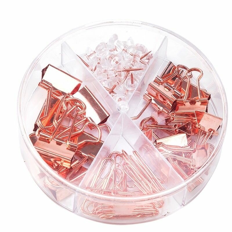 Канцелярский набор Deli 4 отделения, кнопки, скрепки, зажимы, розовое золото (78553) интересное: