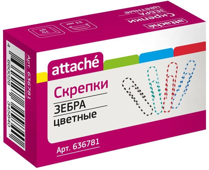Скрепки Attache Зебра с полимерным покрытием,33 мм,разноцветные,70 шт/уп. 636781