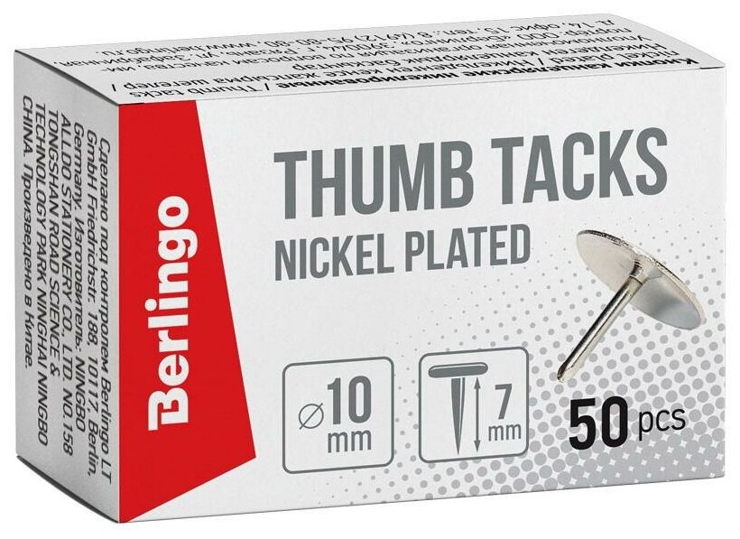 Кнопки канцелярские Berlingo, d=10мм, металлические никелированные, 50шт., картонная упаковка (RN5010n)