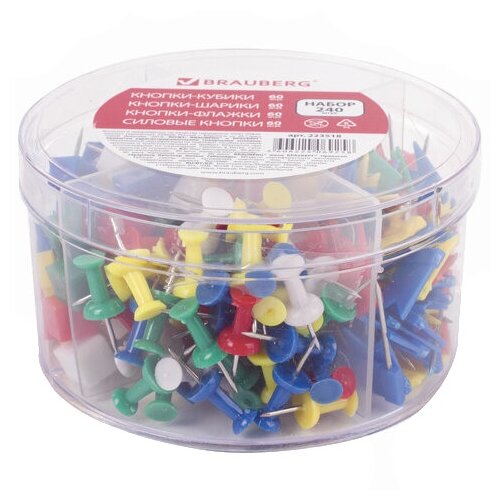 Набор канцелярский Brauberg силовые кнопки, 60 шт, шарики 60 шт, кубики 60 шт, флажки 60 шт (223518)
