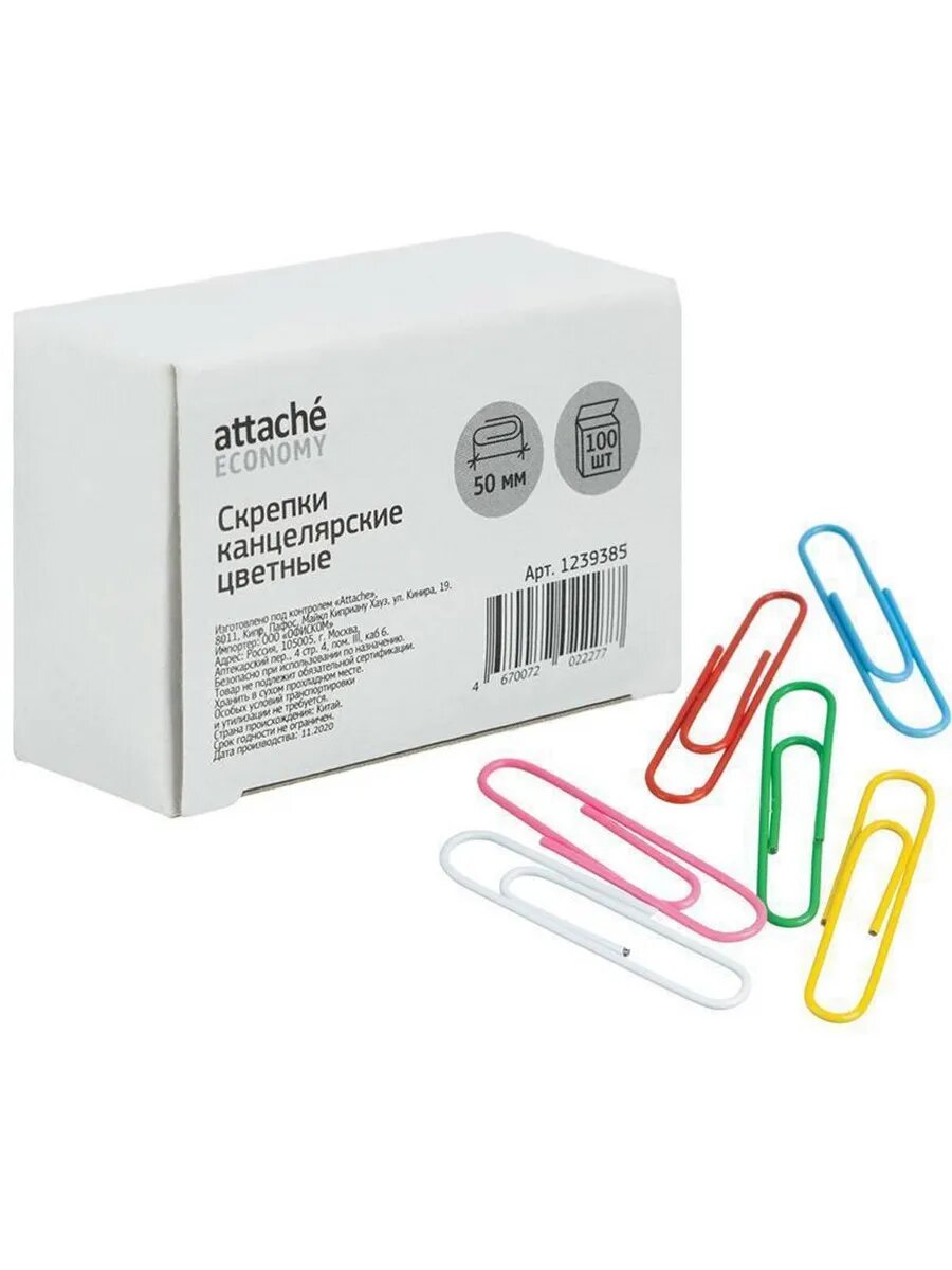 Скрепки Attache Economy с полимерн. покрытием, 50 мм,разноцветные,100 шт/уп