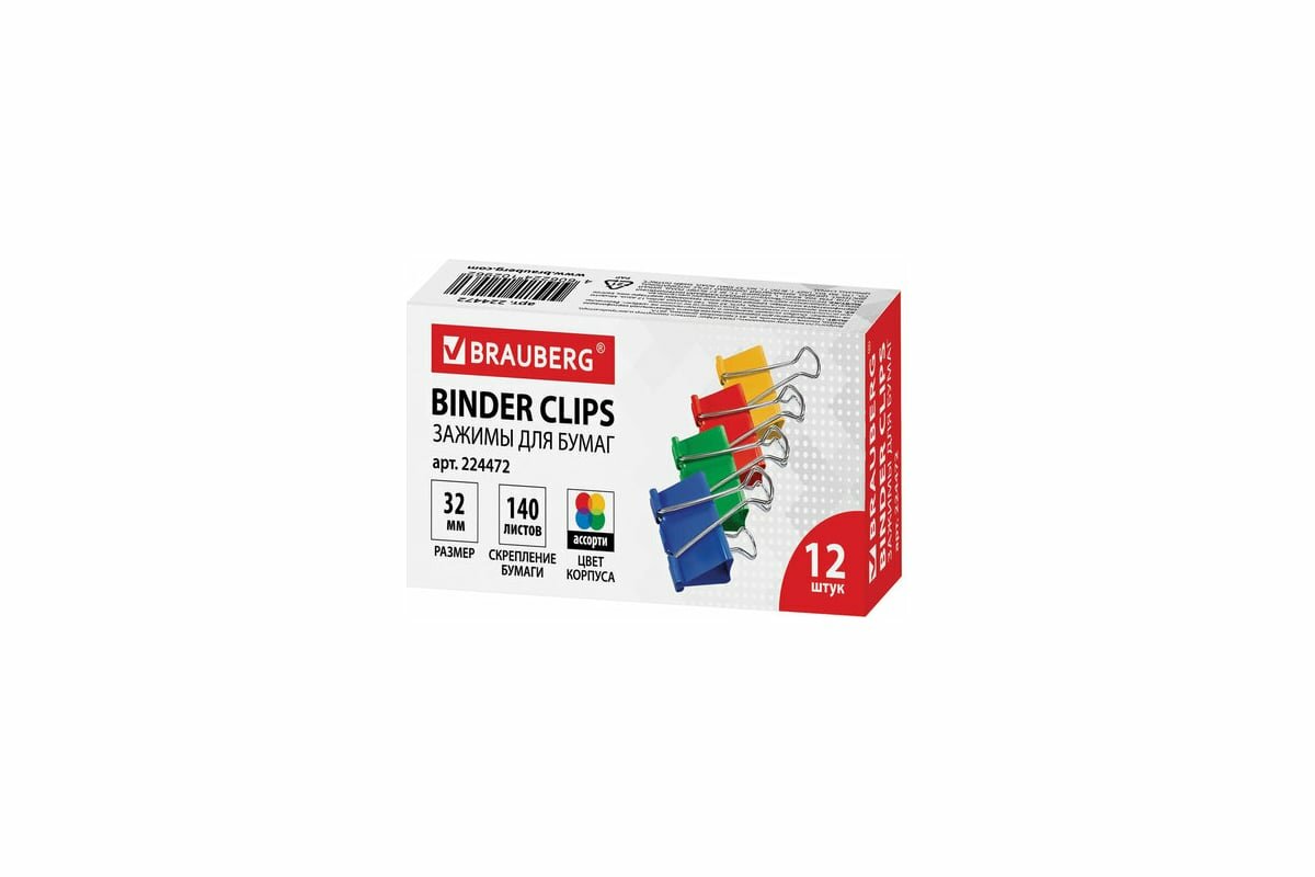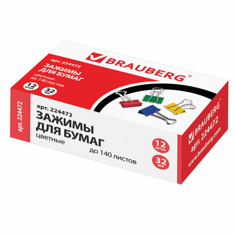Купить Зажимы для бумаг BRAUBERG, комплект 12 шт., 32 мм, на 140 листов, цветные, картонная коробка, 224472
