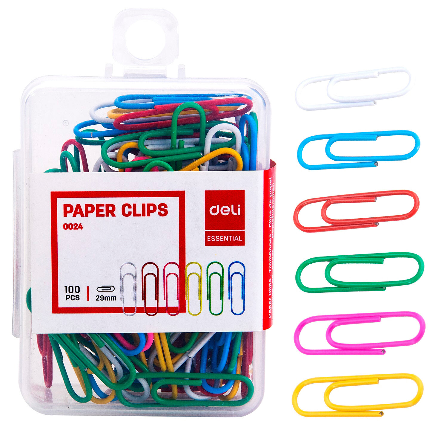Купить Скрепки Deli E0024 пластиковая оболочка 29мм ассорти (упаковка: 100 штук) пластиковая коробка