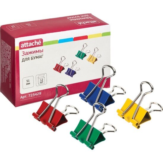 Купить Зажим для бумаг ATTACHE , 51 мм, 12 шт., цветные, в карт.коробке