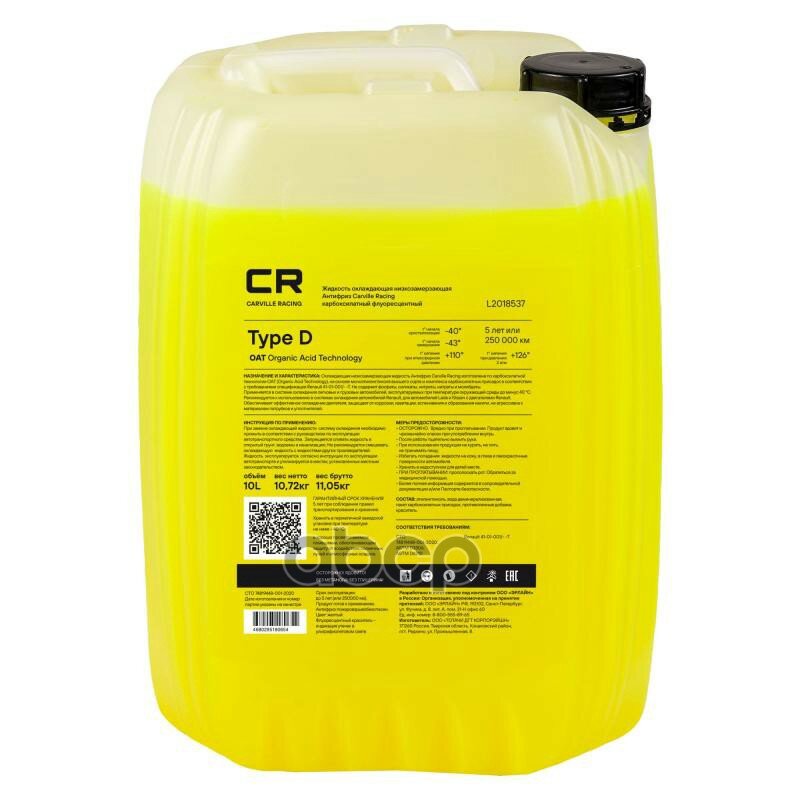 Антифриз Cr Для А/М Renault (Лада, Nissan), Type D, Флуор. -40°с, Желтый, Готовый, 10л/10.74кг L2018537 Carville Racing арт. ...