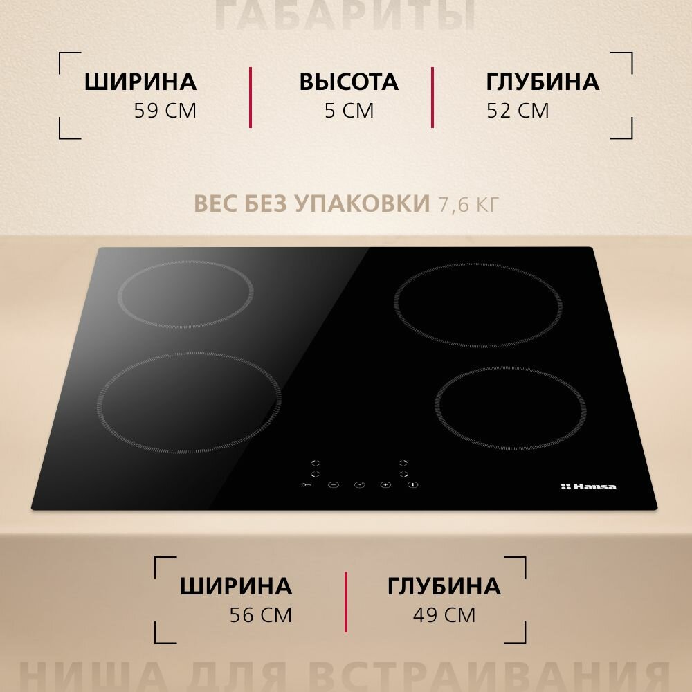 Электрическая варочная панель Hansa BHC633005, стеклокерамическая поверхность, блокировка от детей, таймер, автоотключение, индикация остаточного тепла, черная