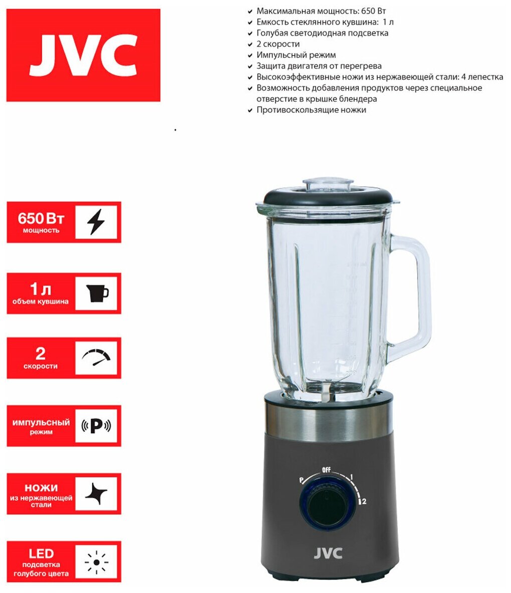 Блендер стационарный JVC с импульсным режимом, 2 скорости, стеклянный кувшин 1 л, ножи из нержавеющей стали, 650 Вт