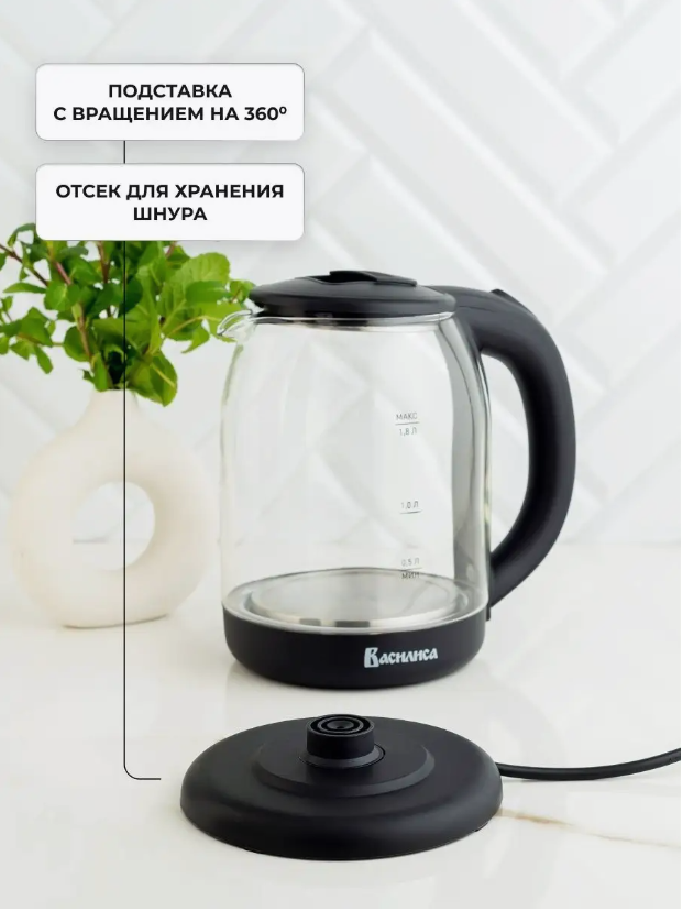 Чайник василиса ВА-1034, корпус из жаропр. стекла, черный: 1500 Вт, 1,8 л