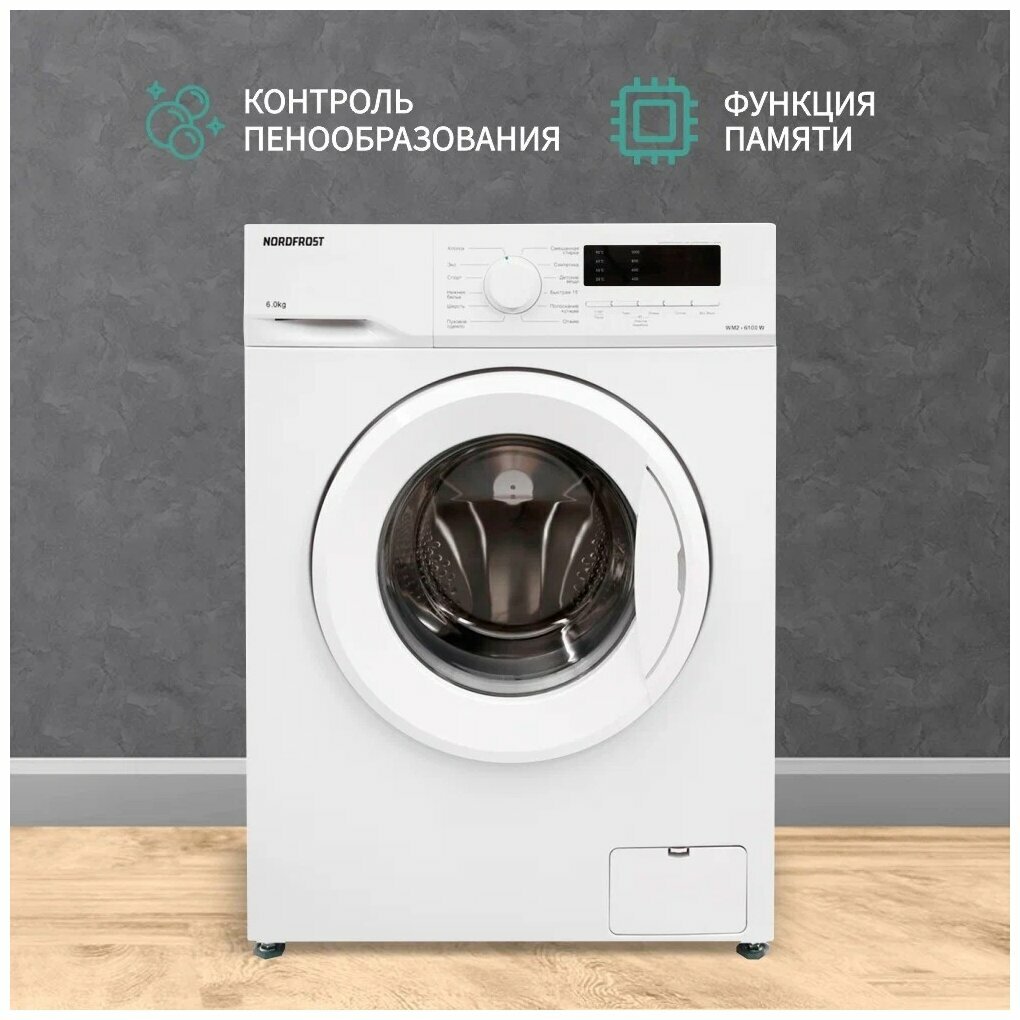 Стиральная машина NORDFROST WM2 6100 W, 6 кг загрузка, 40 л объем, 1000об/мин,12 программ, отсрочка старта, быстрая стирка, LED-дисплей, цвет белый