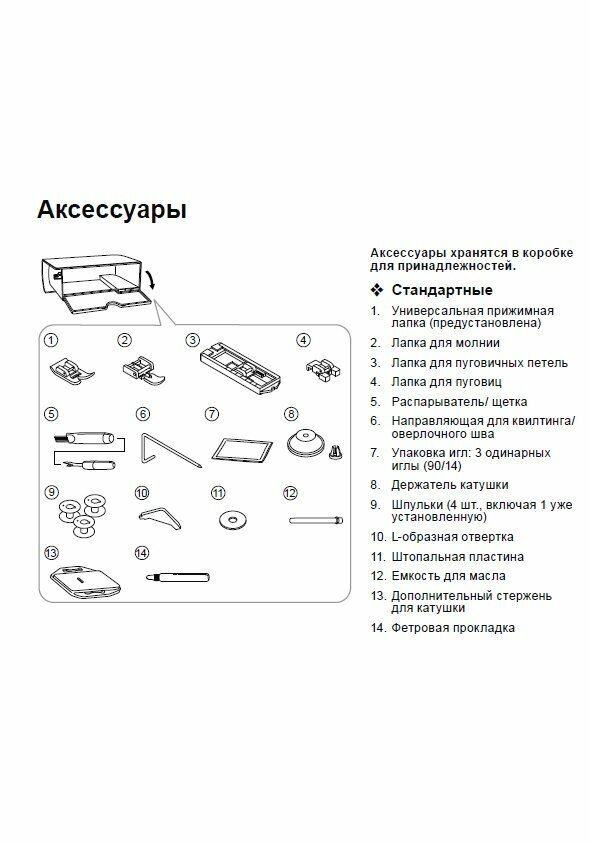 | Лапки в комплекте | для вшивания молнии, для пришивания пуговиц |