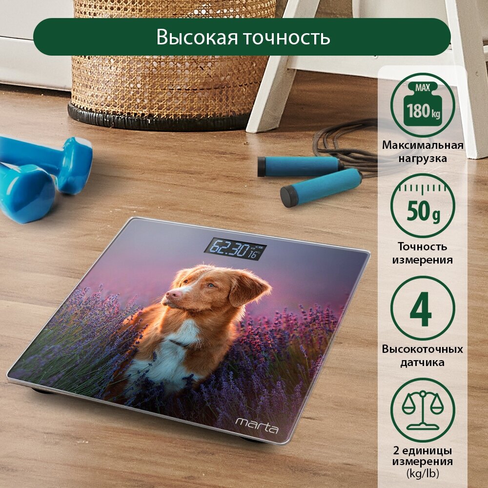 MARTA MT-1608 собака в лаванде весы напольные сенсор, встроенный термометр интересное: