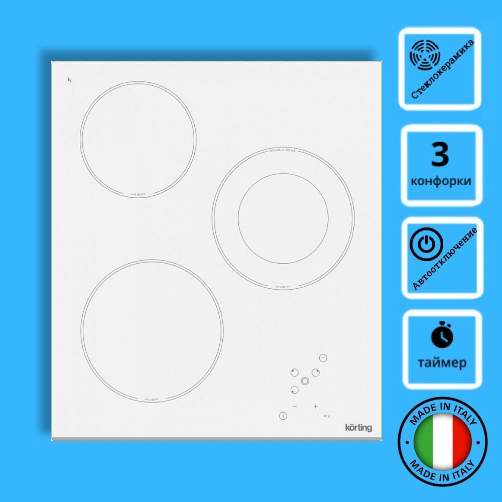 Встраиваемые электрические панели Korting/ Электрическая, 5х45x51 см, стеклокерамика, 3 конфорки, сенсорное управление, скошенный передний край, белая