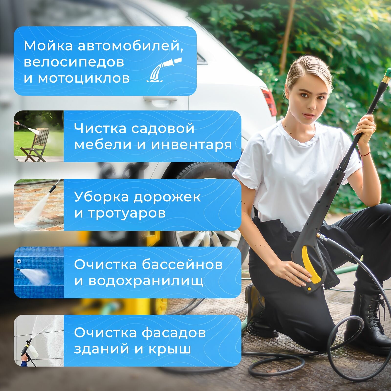 | Минусы: | Без шампуня использовать для мойки авто бесполезно. Немного шумная во время нагнетания давления. |