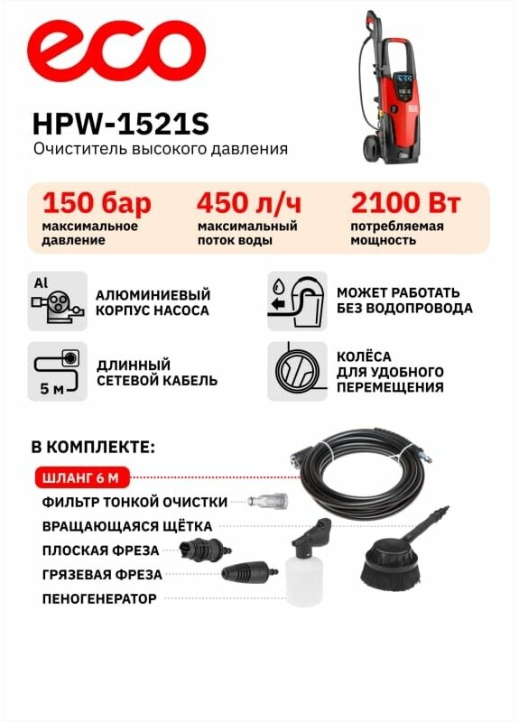 Мойка высокого давления Eco Мойка высокого давления ECO HPW-1521S (HPW1521S0001), 150 бар, 450 л/ч