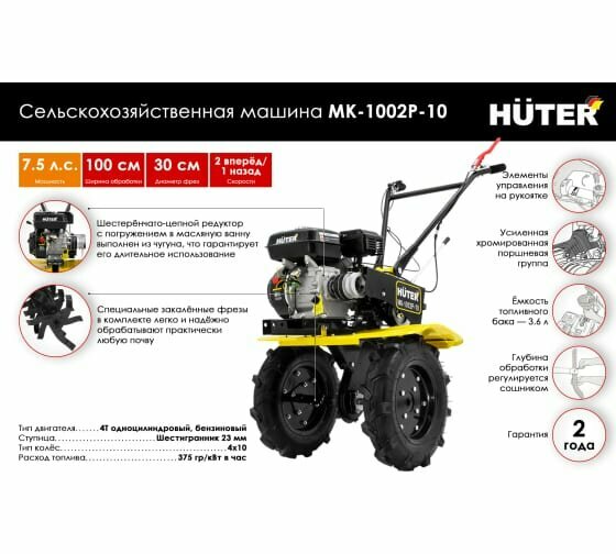 Мотоблок HUTER МК-1002Р-10//подарок/5520Вт, 7.5лс, 100см