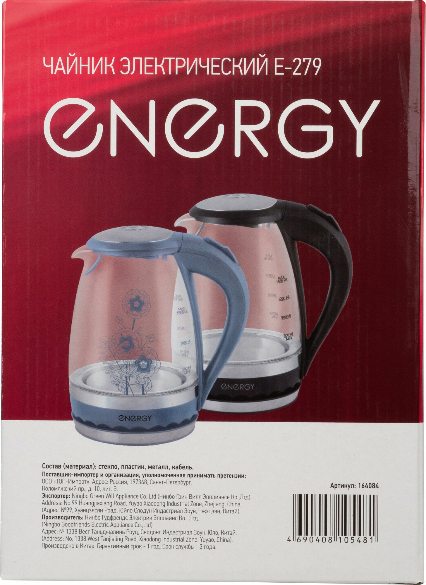 NINGBO GOODFRIENDS ELECTRIC APPLIANCE CO.,LTD. чайник электр. "ENERGY" E-279 1,5 Л (синий) (1/6) стекло