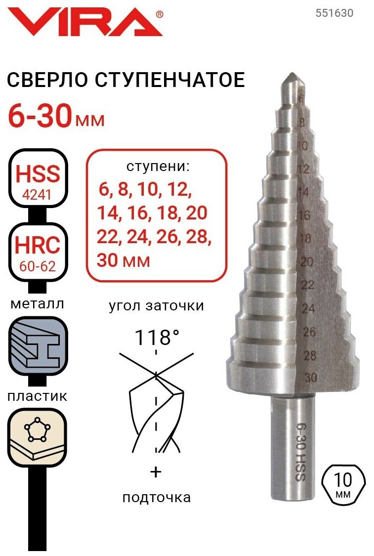 Сверло по металлу vira ступенчатое 6-30мм шаг 2мм 13 ступеней