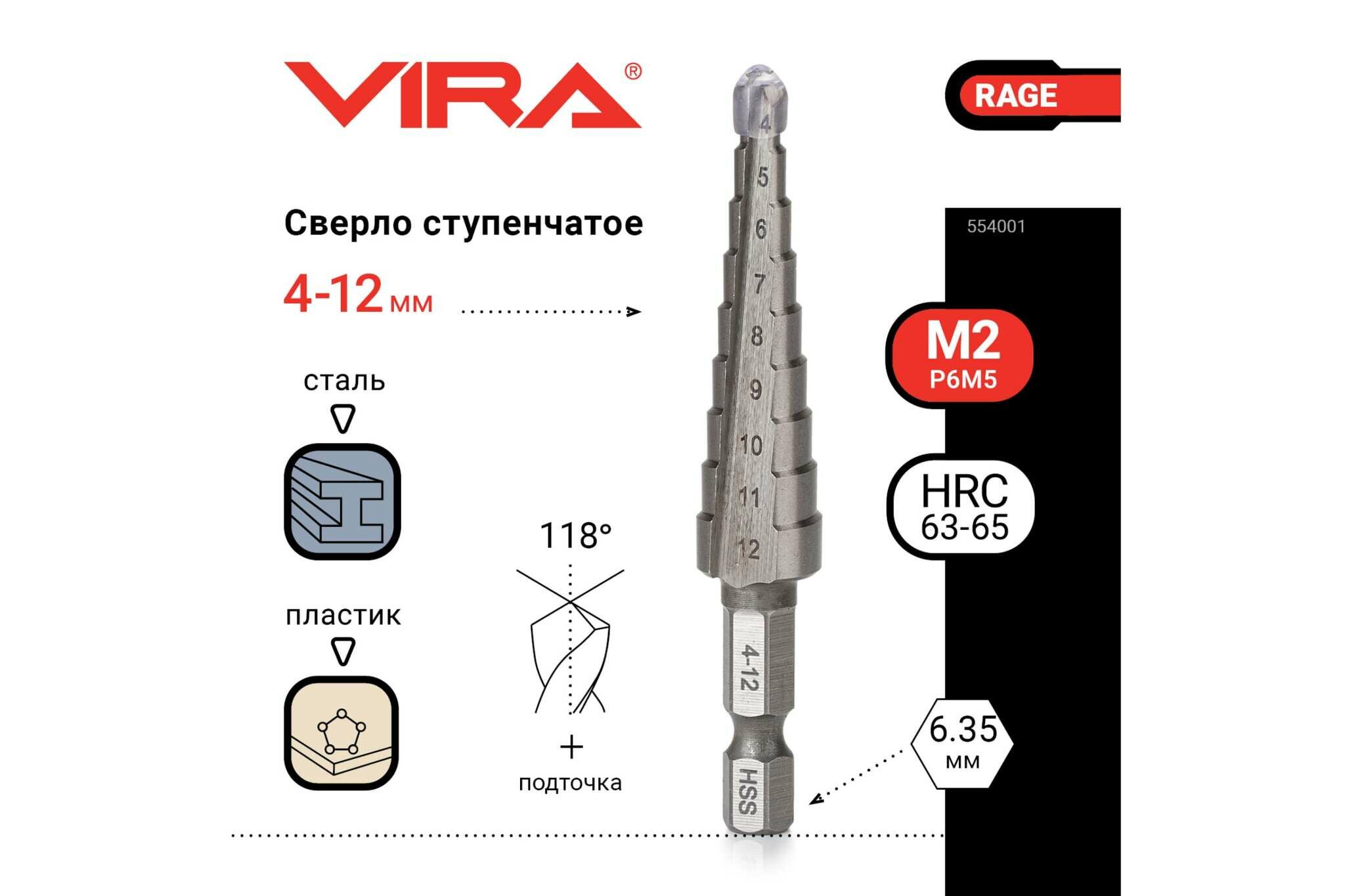 Сверло по металлу ступенчатое VIRA RAGE 4-12мм