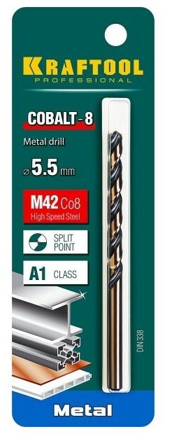 KRAFTOOL COBALT 5.5 х93мм, Сверло по металлу HSS-Co(8%) , сталь М42(S2-10-1-8)