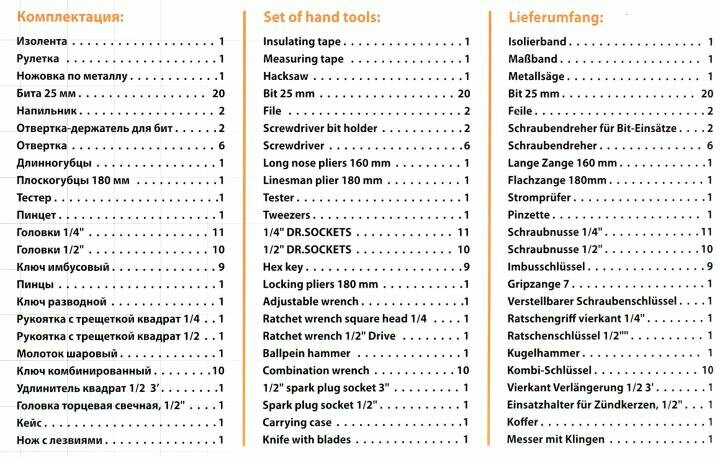 | Инструменты в комплекте | молоток / отвёртки / плоскогубцы / длинногубцы / ножовка по металлу / ключи гаечные / ключ разводной / ключи имбусовые (шестигранные) / рукоять для головок |