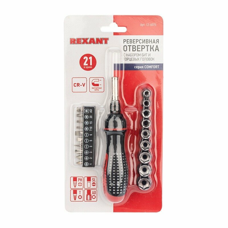 Набор головок и бит с реверсивной отверткой, 21 предмет Rexant 12-6075 .