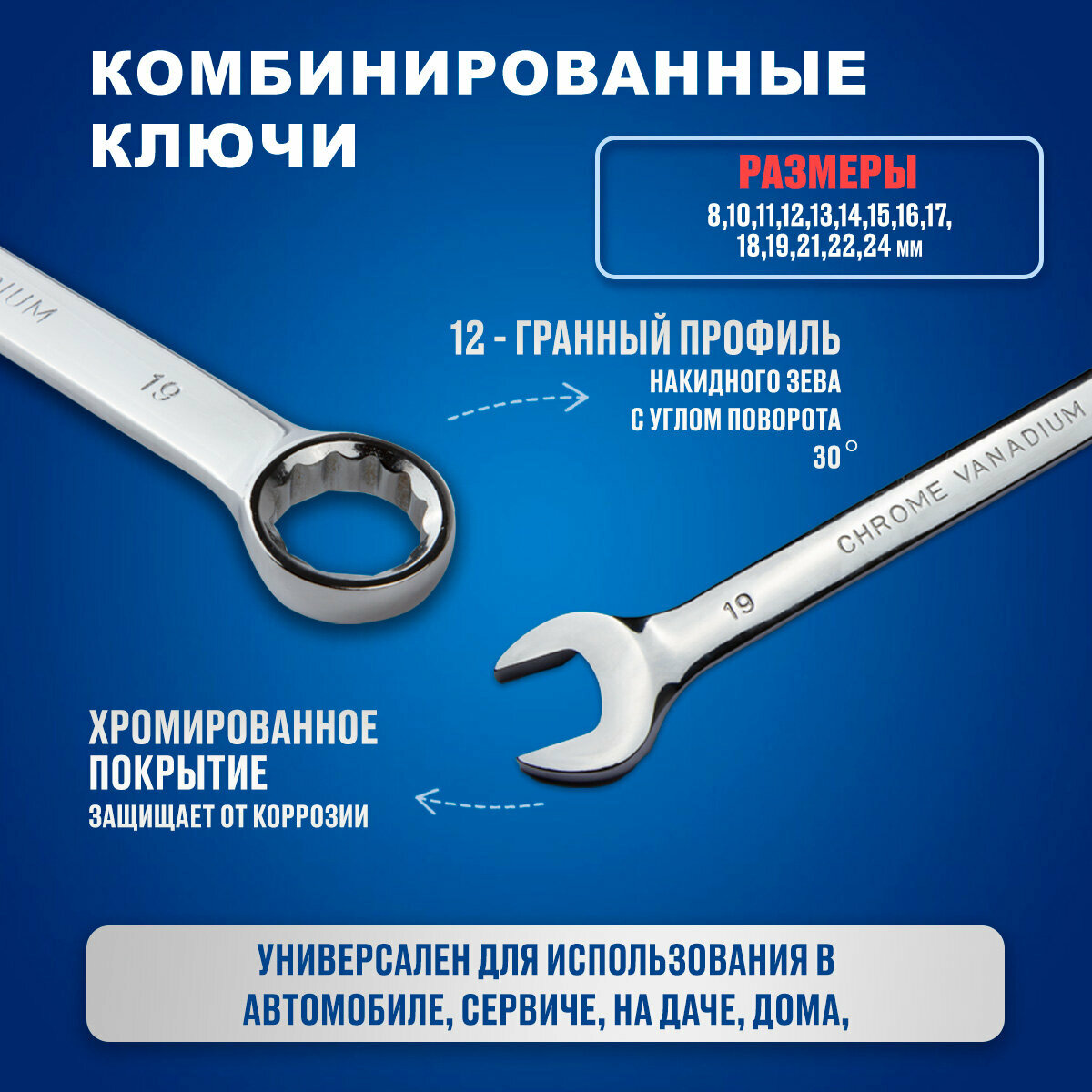 | Инструменты в комплекте | вороток для головок / трещотка / Ключи комбинированные трещоточные/ Удлинитель 1/2 / Карданный шарнир 1/2 / Головки свечные |