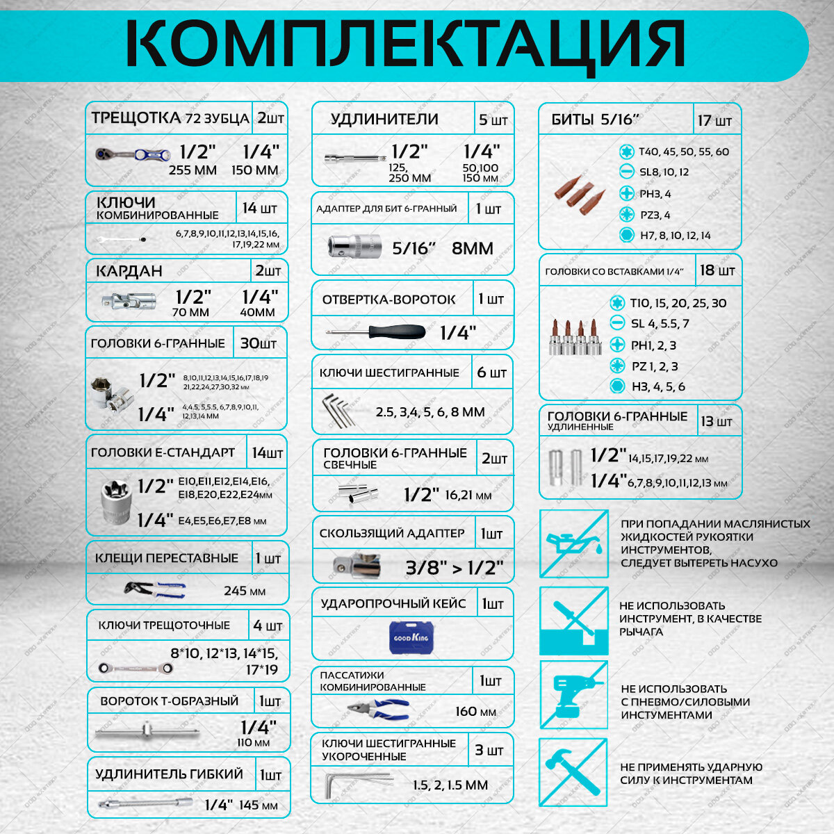 | Головки торцевые подробно | 1/2": 8, 10, 11, 12, 13, 14, 15, 16, 17, 18, 19, 21, 22, 24, 27, 30, 32 мм; E-стандарт 1/2": E10, E11, E12, E14, E16, E18, E20, E22, E24; удлинённые 1/4": 6, 7, 8, 9, 10, 11, 12, 13 мм; свечные 1/2": 16, 21 мм; удлинённые 1/2": 14, 15, 17, 19, 22 мм; торцевые головки E-стандарт 1/4": E4, E5, E6, E7, E8; 1/4": 4, 4.5, 5, 5.5, 6, 7, 8, 9, 10, 11, 12, 13, 14; с наконечниками 1/4": удлинённые крестообразные Pozidriv: PZ1, PZ2, PZ3, шестигранные Femelle Hexagon HEX: H3, H4, H5, H6, прямой шлиц Slot: S4, S5.5, S6.5, биты-звёздочки TORX: T10, T15, T20, T25, T30, крестообразные Phillips: PH1, PH2, PH3 |