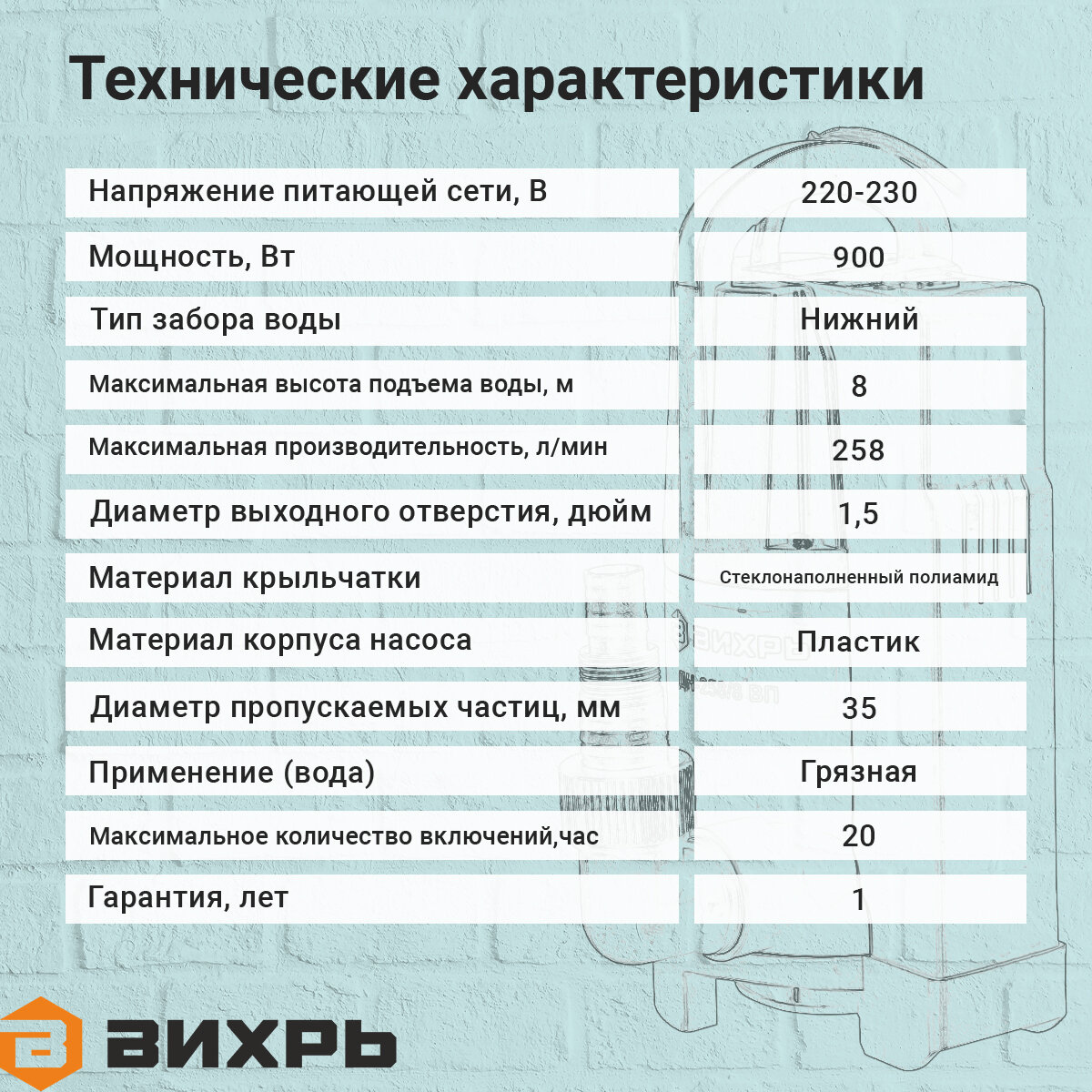 Дренажный насос Вихрь ДН-258/8 ВП, 900 Вт, макс. напор – 8 м, 258 л/мин, для грязной воды