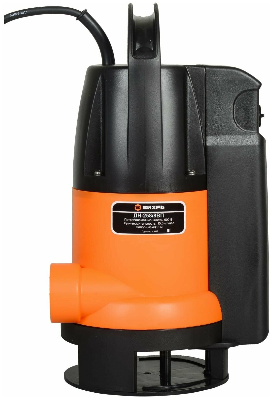 | Дополнительная информация | Преимущества Вихрь ДН-258/8 ВП Пластиковый ударопрочный корпус; Автоматическая работа благодаря поплавковому выключателю; Защита от перегрева делает насос ещё более надежным; Ручка для удобства переноски; Многофункциональны – подходят для выкачивания любых не очень агрессивных жидкостей; частота питающей сети, ГЦ - 50, Максимальная производительность, л/час - 15500 |