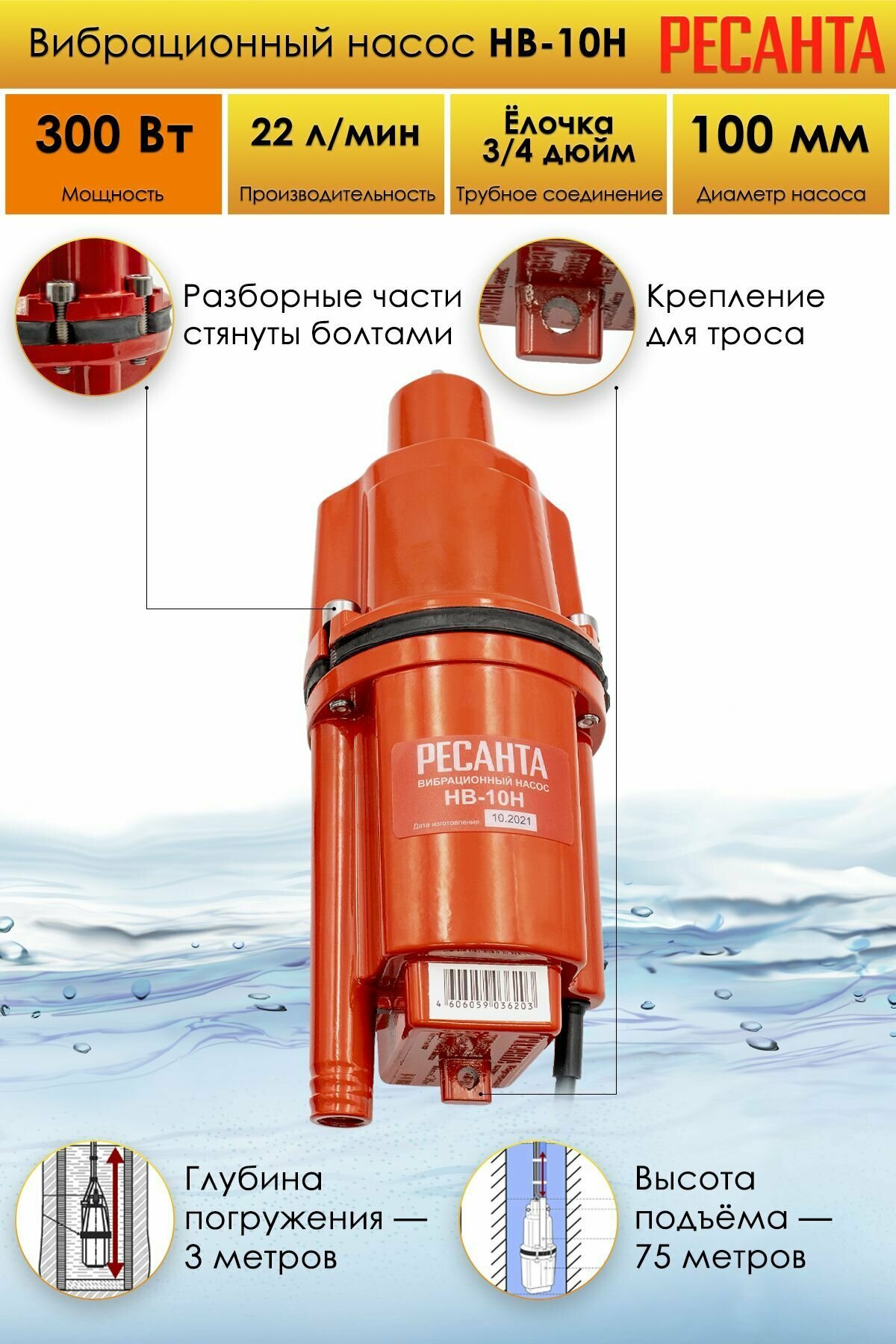 Вибрационный насос Ресанта НВ-25Н(300Вт, высота 75м, глубина 3м, диаметр 100 мм, 22 л/мин)