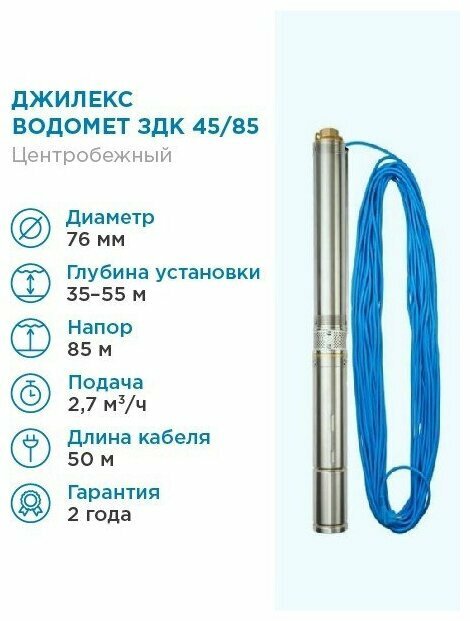 Насос скважинный Джилекс водомет 3ДК 45/85 (1х220В; 1,00кВт) с кабелем 50 м.