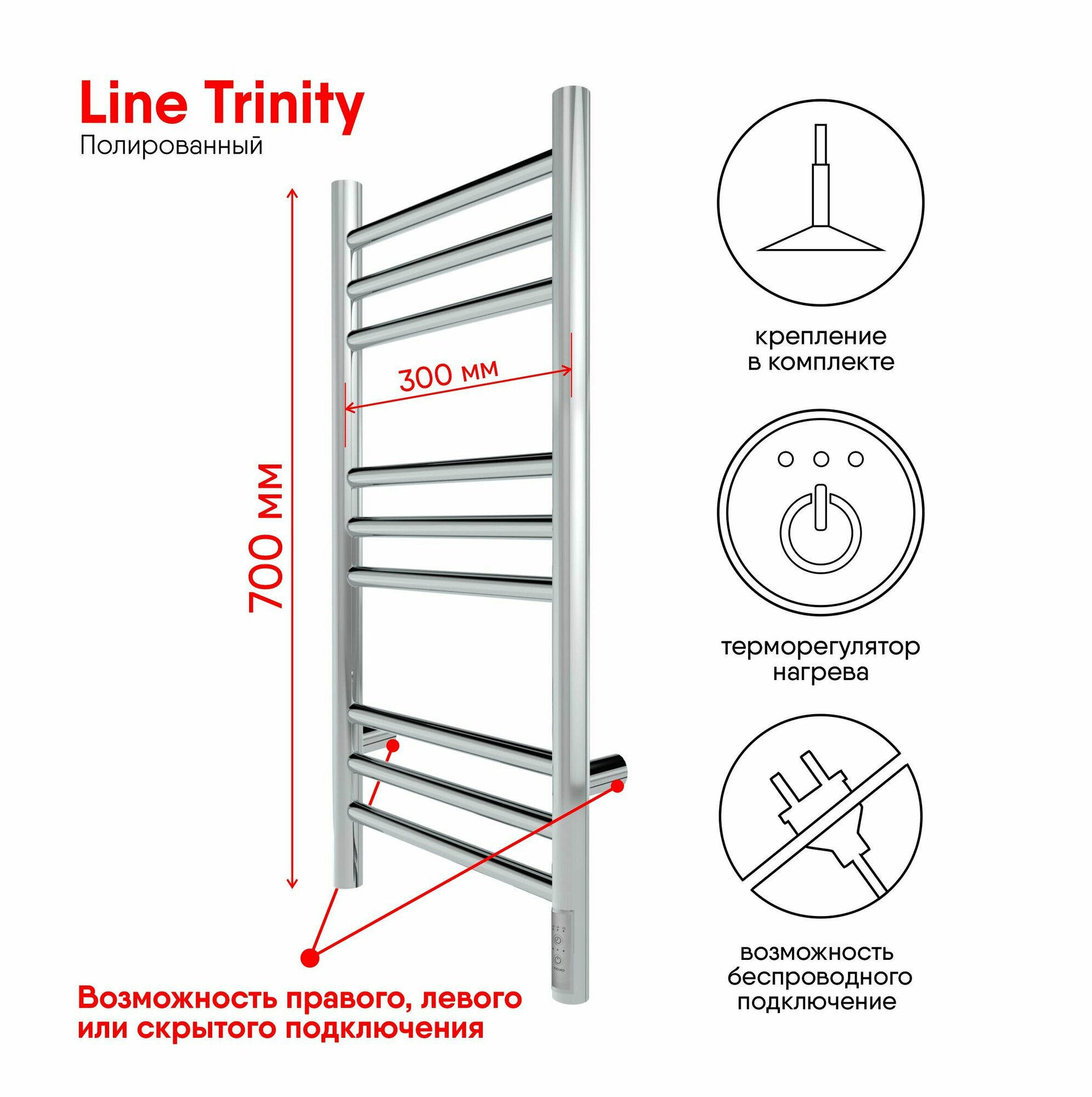 Полотенцесушитель Line Trinity электрический 70/30 (таймер, скрытый монтаж, универсальное подключение, Полированный) INDIGO