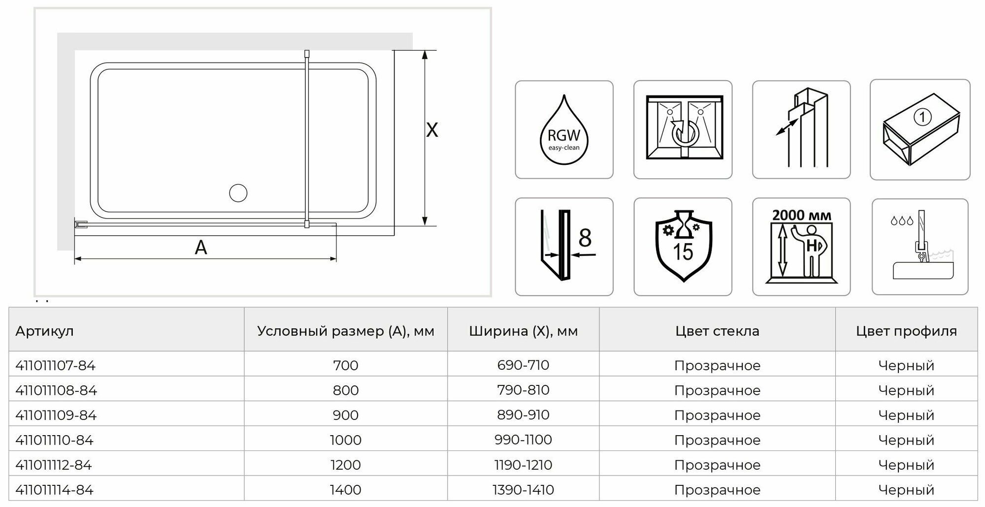 Душевая перегородка RGW WA-11-B 700х2000, профиль черный, стекло прозрачное