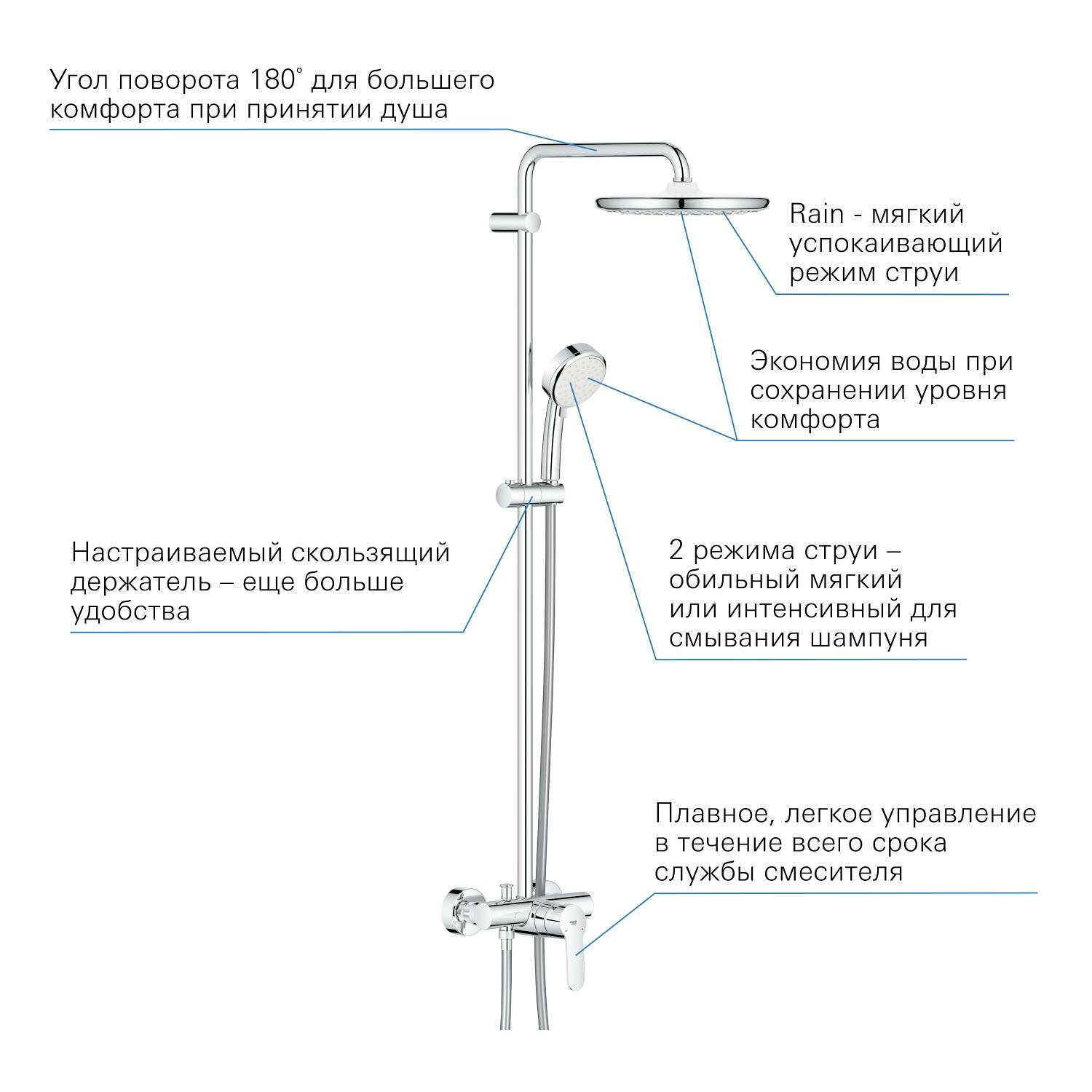 | Особенности | держатель душевой лейки / регулируемый верхний душ / антиизвестковое покрытие / защита от скручивания |