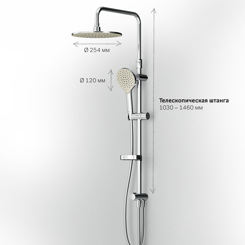 | Дополнительная информация | высота стойки для душа: 1200 мм; диаметр душевой лейки: 110 мм; диаметр верхнего душа: 254 мм |