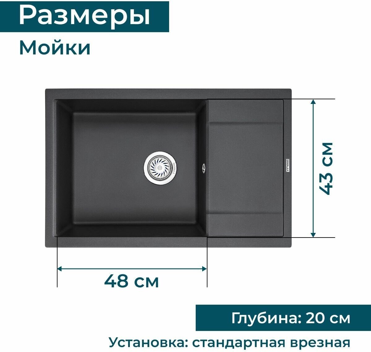 Кухонная мойка кварцевая Granula GR-7805 прямоугольная с крылом, врезная, чаша 480х440, цвет базальт (7805bt)