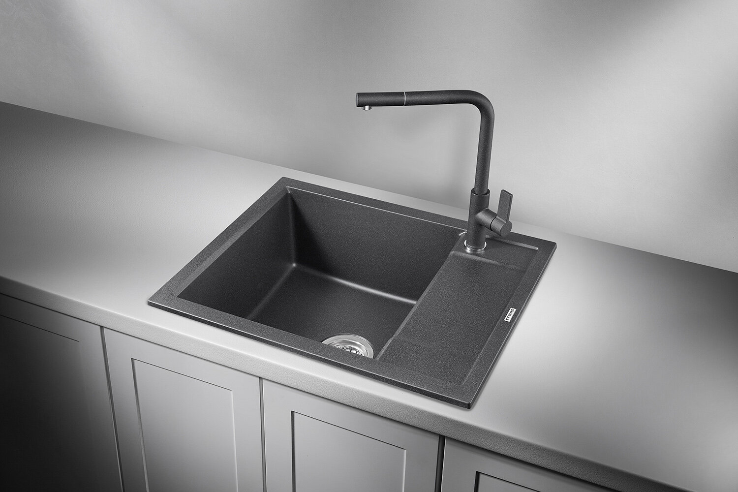 Каменная мойка для кухни врезная с крылом GRANULA 60x50x20 Кухонная раковина в комплекте с сифоном. Цвет черный металлик